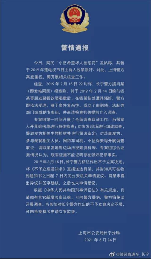 2021年8月24日当晚23时30分,上海市公安局长宁分局于作出《警情通报》,经专案组综合证据情况认为:现有证据不能证明存在强奸犯罪事实。